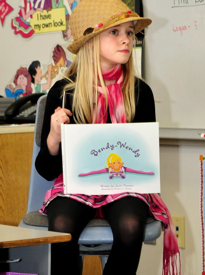 The young author talked to Mt. Blue elementary students about rewriting the book 75 times with an editor and overcoming her struggle with reading while learning at her own pace.