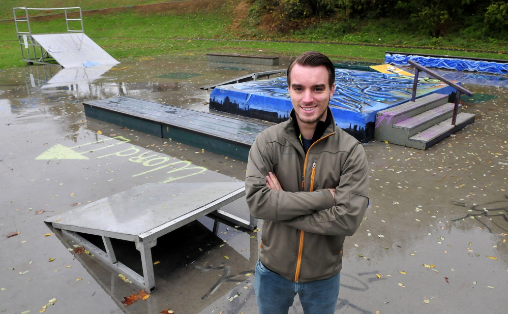 Dave Dutil, a senior at Thomas College, is raising funds to improve the Green Street skate park in the city’s South End.