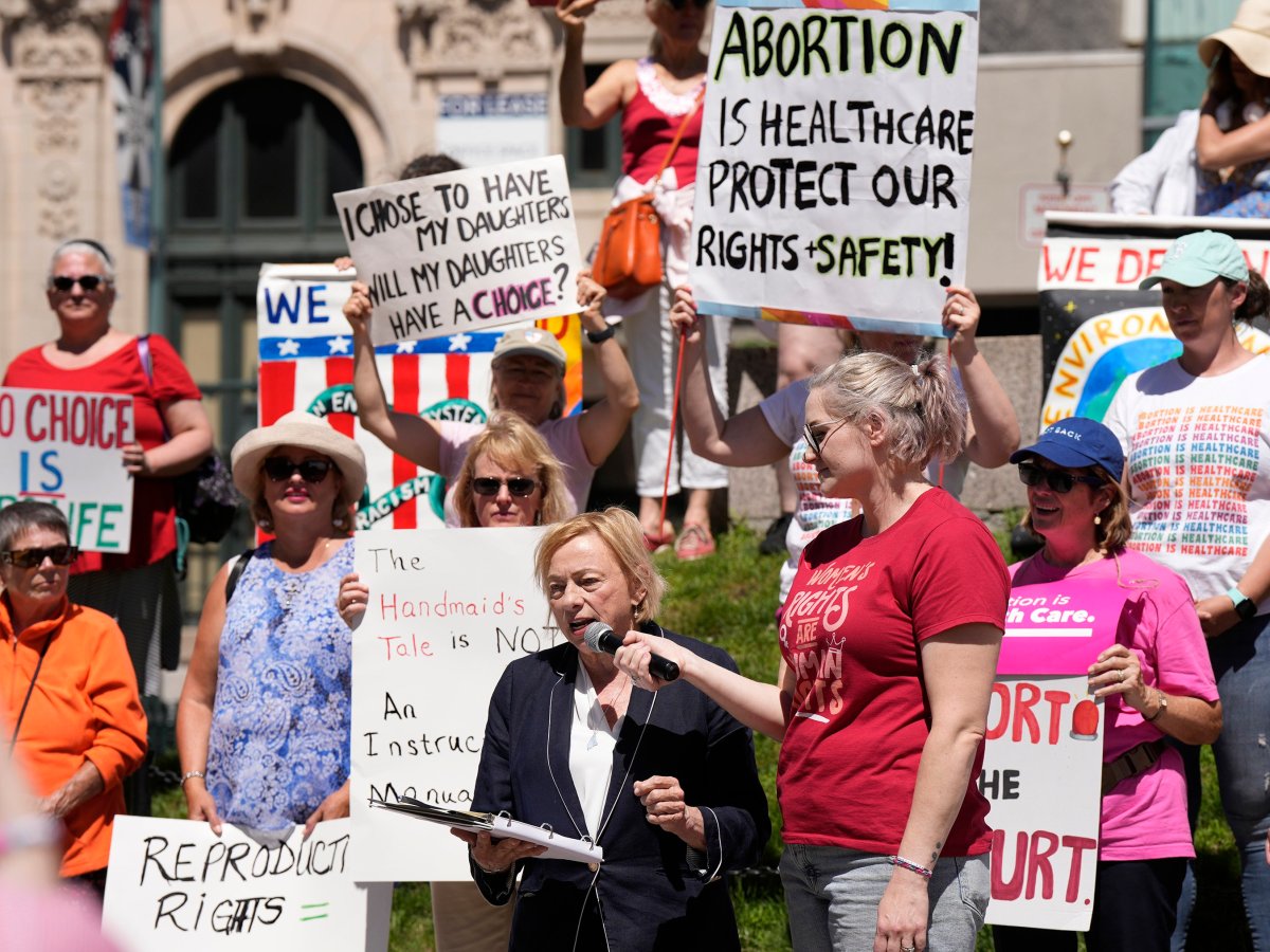Roughly 100 people joined Gov. Janet Mills and other Democratic party leaders at the protest to urge voters to protect access to abortion at the polls this fall.