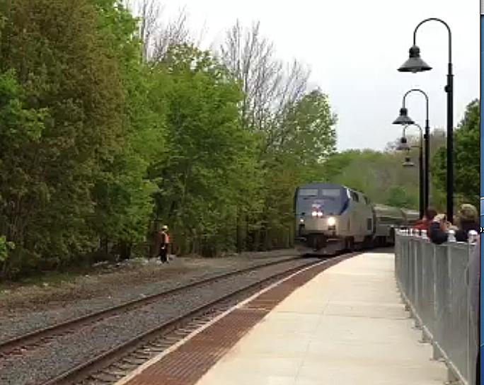 FREEPORT — The Amtrak Downeaster clanged its way into town Monday morning for a celebration marking the completion of a passenger platform that will serve the train when it starts providing service north of Portland in the fall.