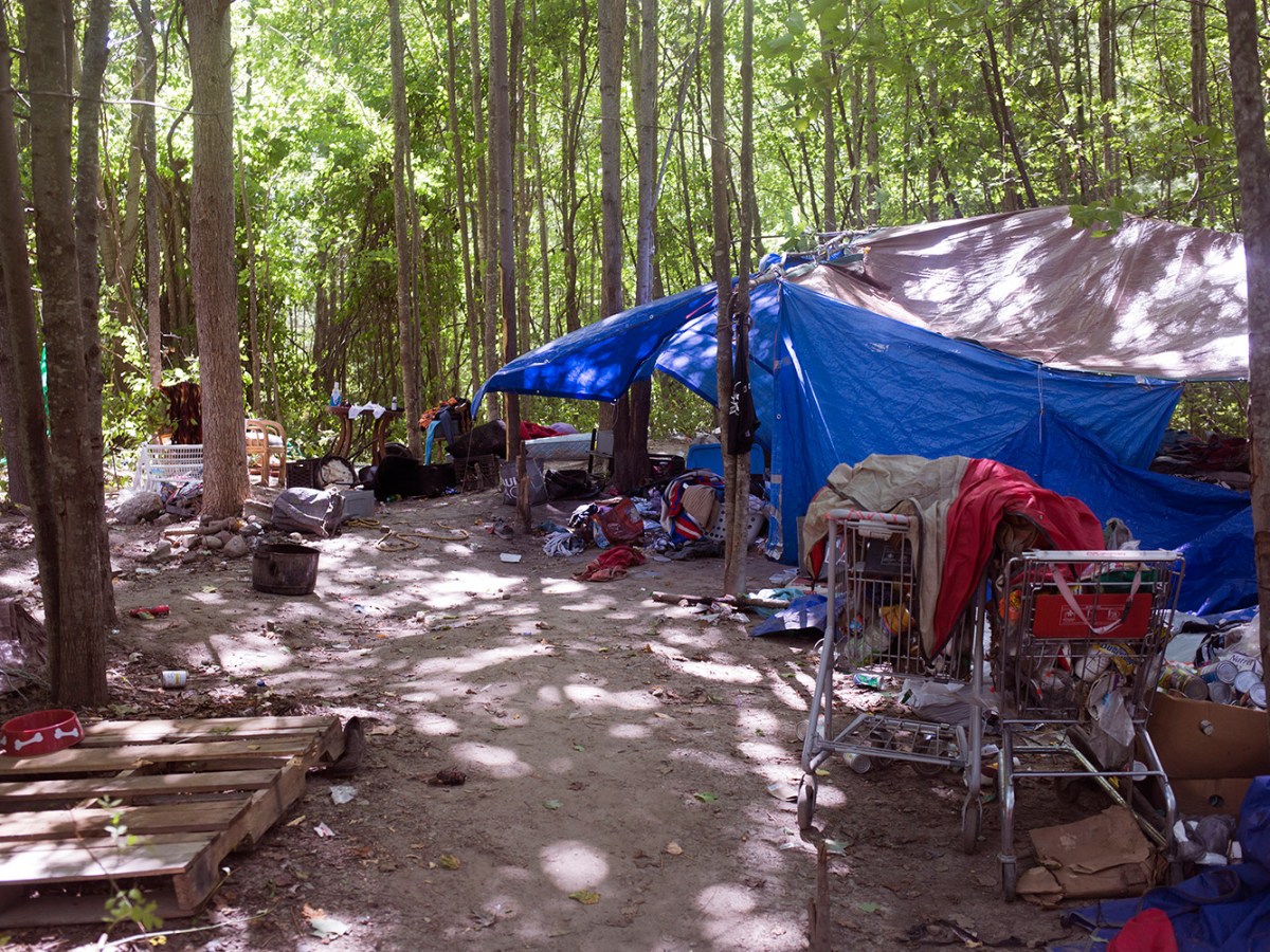 The former ‘Tent City’ encampment is abandoned in response to a police advisory, but debris is strewn across the private property behind Pine Tree Shopping Center.