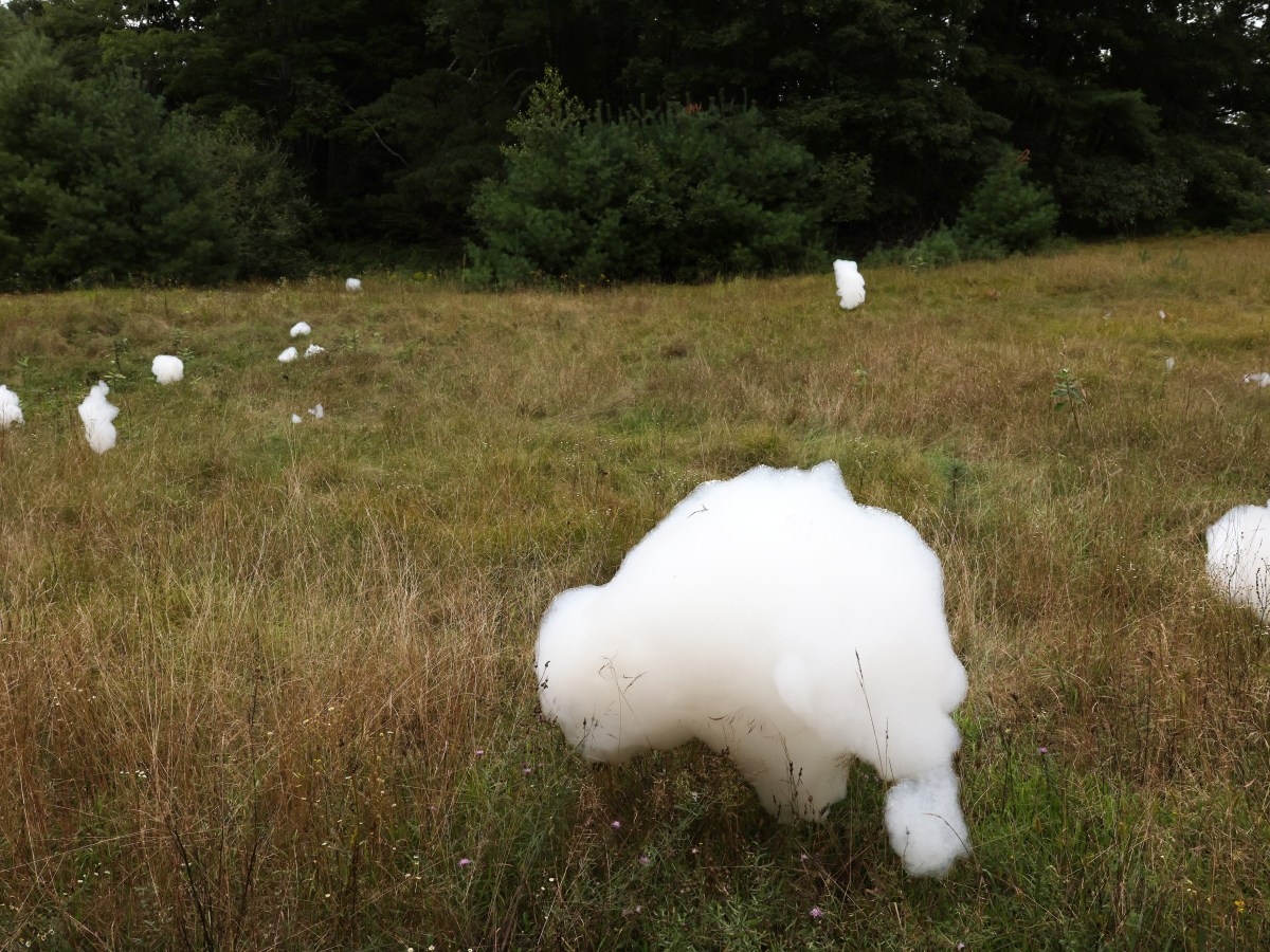 Foam has been building up in ponds and billowing through the air near Brunswick Landing since 1,600 gallons of fire-suppressing chemical was accidentally released Monday.