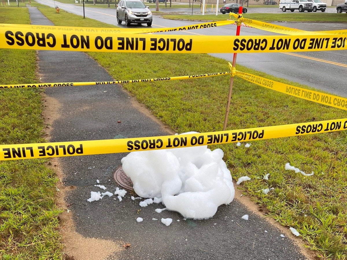 Officials say a fire suppression system malfunctioned, discharging 1,600 gallons of firefighting foam concentrate – 4 to 5 feet deep in some places – at the former Naval Air Station.