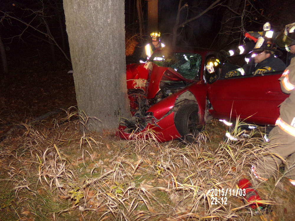 Evangeline Phillips and her 15-year-old grandson suffered injuries that were not considered life-threatening after her car veered off the road and struck a pine tree.