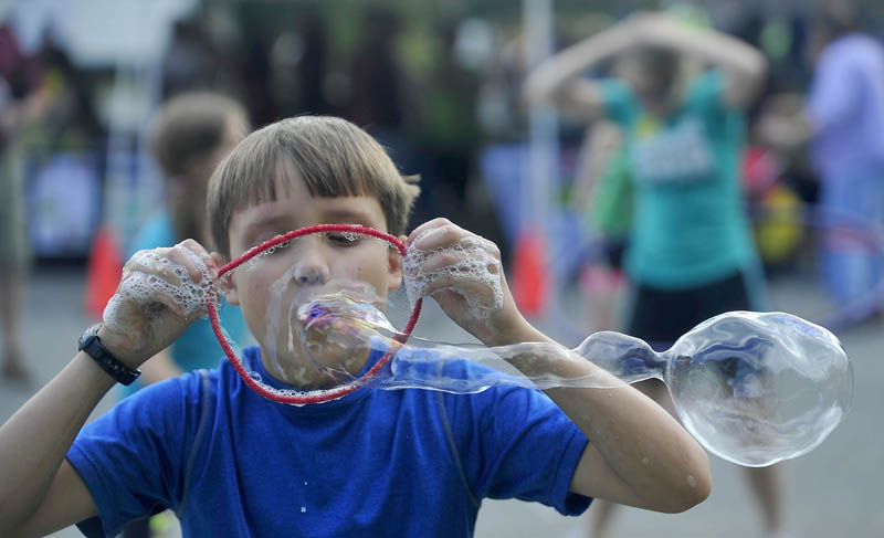 Charlie Frost, 9, of Canaan, blows bubbles through a form made from a giant pipe cleaner at Inland Hospital’s Family Fun Day in Waterville today.