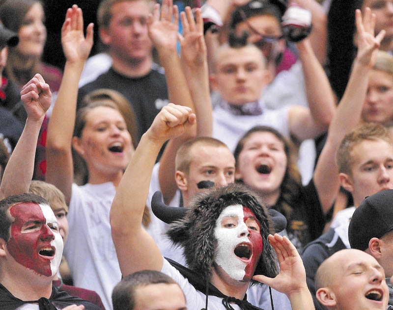 Nokomis High School senior Austin Chapman, bottom center, leads the student section in a cheer before their boys’ team played Gardiner in an Eastern B quarterfinal at the Bangor Auditorium on Friday. Nokomis lost the game in overtime, 56-47.