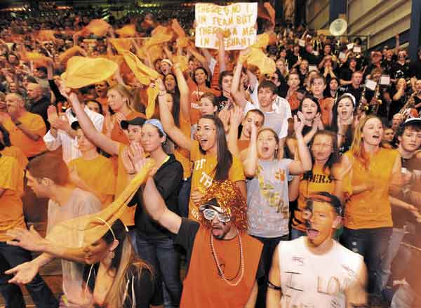 ORANGE CRUSH: Gardiner Area High School fans cheer on the Tigers during the Class B state championship game against Yarmouth on Friday night at the Bangor Auditorium. Gardiner lost 65-53.