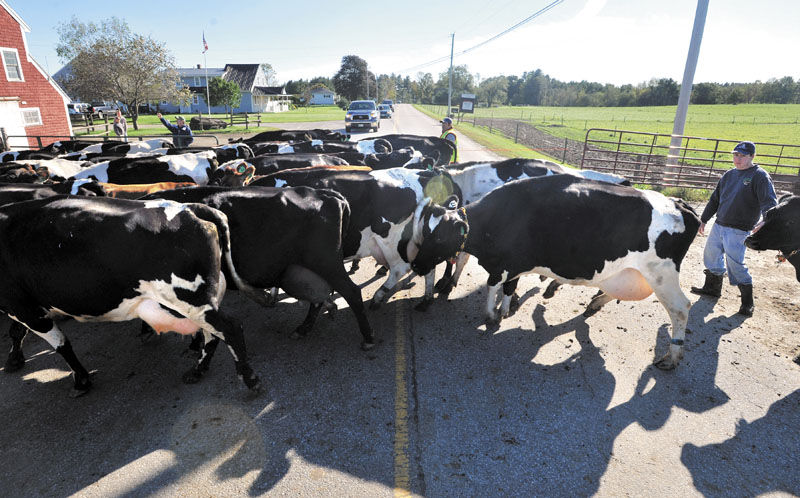 Nate Libby, far right, with Rainbow Valley Farm, ushers dairy cows across West River Road in Sidney after an afternoon of grazing in the pastures Thursday. The dairy cows spend most of the day in the pastures feeding on grass and spend the night in the barn.
