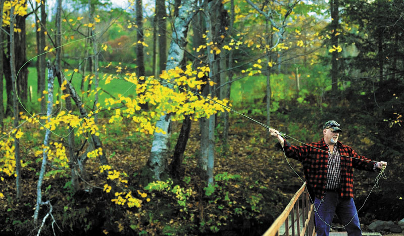 Bob Nason casts a streamer fly on Messalonskee Lake from the dam in Oakland on Friday night.