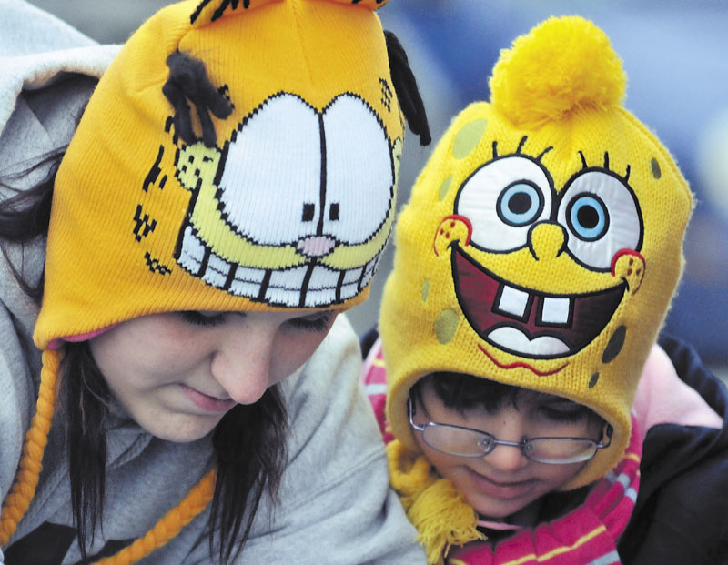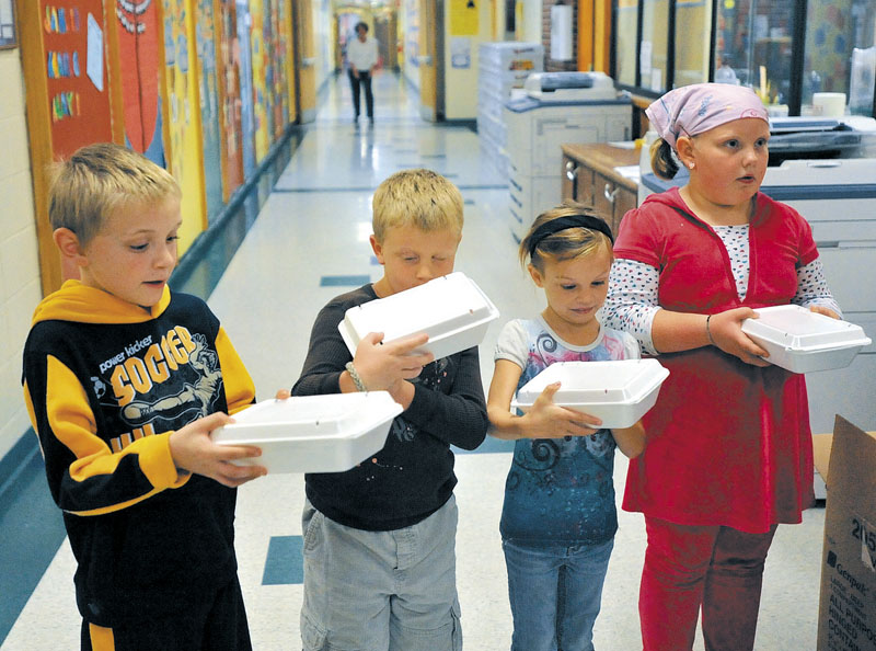 George J. Mitchell School students, from left, Alan Brooker, 8, Andrew Wolman, 7, Ashley Harwood, 8, and Elle King, 7, prepare to store lobster sandwiches made by volunteers from the Maine Children’s Home in a refrigerator at the school in Waterville on Friday. Sandwich proceeds go to the Christmas Program at the Maine Children’s Home.