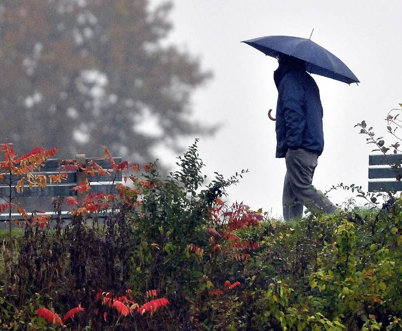A soccer spectator makes his way to the field for the boys’ matchup between Mt. Blue High School and Bangor High School at the University of Maine at Farmington soccer fields on Thursday