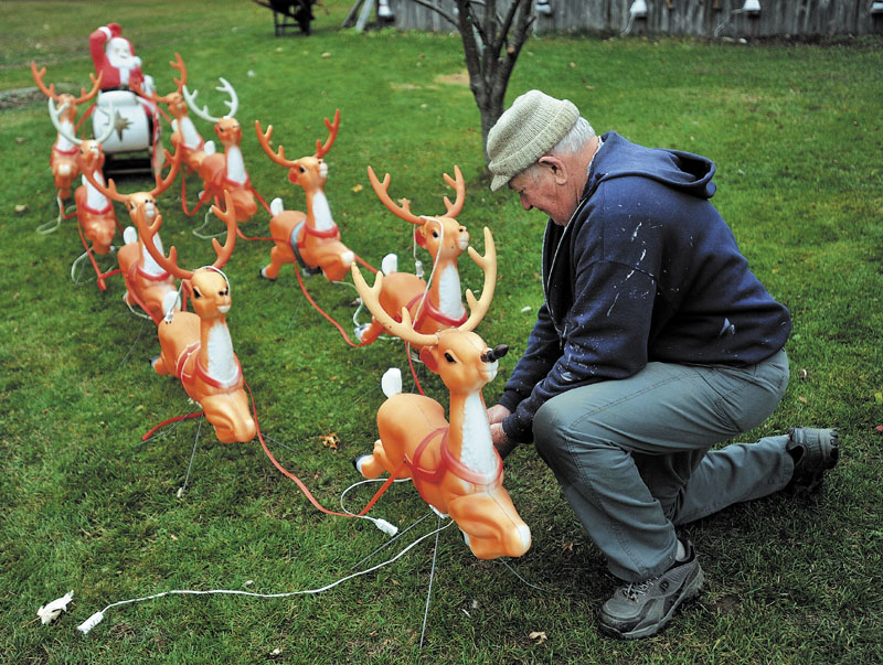 Raymond Moody puts the finishing touches on his Santa Claus decorations in front of his Main Street residence in Anson on Wednesday.