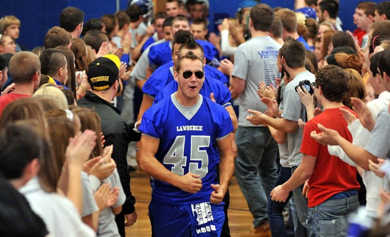 Lawrence High School football player Bryant Wade, No. 45, leads the team in to the gymnasium during a pep rally Friday at the Fairfield school. Lawrence will play Cheverus for the Class A state championship at 11 a.m. today in Portland.