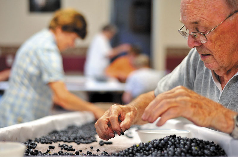 Horace Libby, right, picks through a pile of the nearly 400 pounds of blueberries being cleaned for the 40th annual Blueberry Festival at the Winslow Congregational Church on Monday. The festival will begin Saturday, Aug. 13.