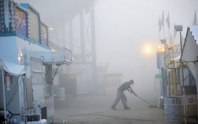 Michael McCarthy sweeps around the rides and game kiosks as the fog lifts at the Skowhegan State Fair early Friday morning.