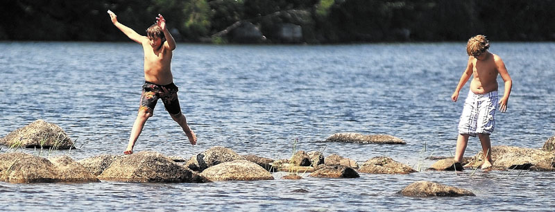 Daniel Turner, 12, of Skowhegan, leaps to a dry rock as he and friend Jonah Wakefield, 11, also of Skowhegan, negotiate their way back to the beach on the west shore of Lake George in Skowhegan on Monday afternoon.