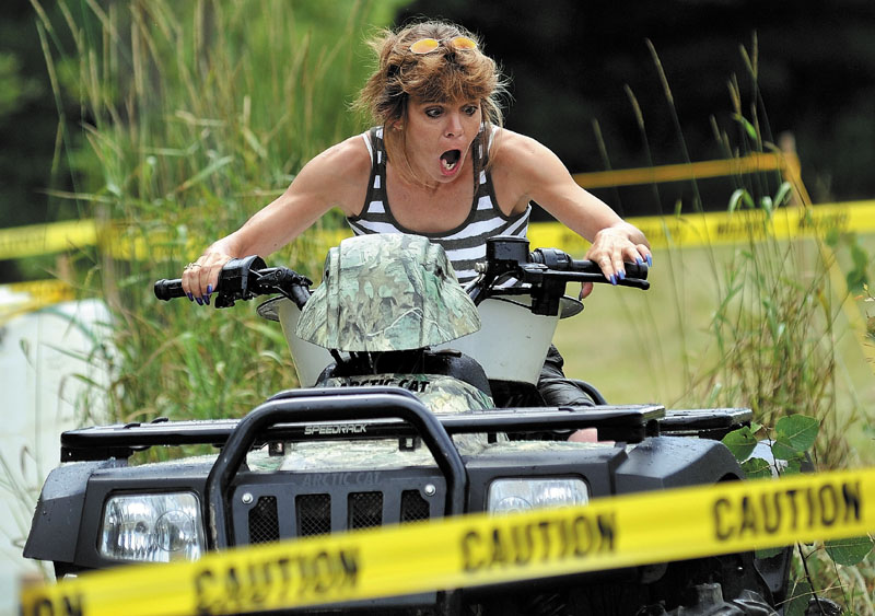 Sandy Gagnon reacts after stalling her ATV during the Bog Water Carry All-Terrain Vehicle contest during Mercer Old Home Days activities on Saturday.