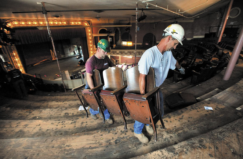 Randy Woodworth, right, and Wil Stevens, left, remove a section of seats from the balcony of the Opera House during renovations on Friday. The renovations are scheduled to be complete by end of February.