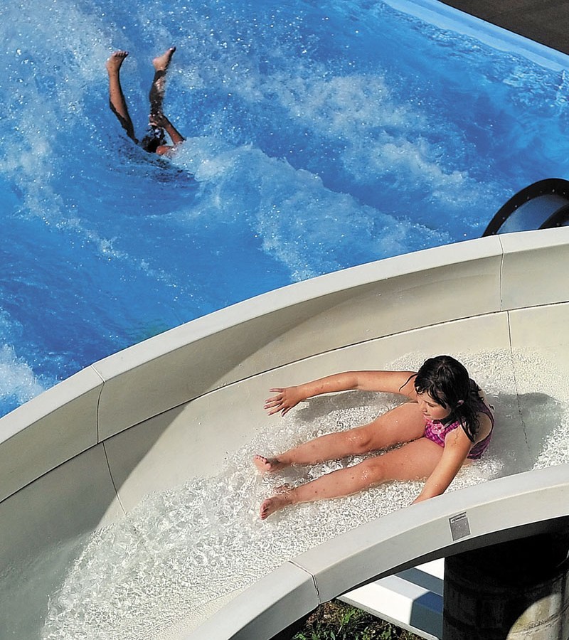 Sydney McKinnis, 8, of Waterville, slides down the big slide at the North Street Pool in Waterville Monday. Even though the day began with rain, the pool was running at full capacity by 4:30 in the afternoon.