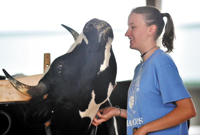 Tammy Chase, 16, has a moment with Thunder, one of the two Holstein shorthorn steers on her pull team, during the steer and oxen show on the second day of the Skowhegan State Fair on Friday.