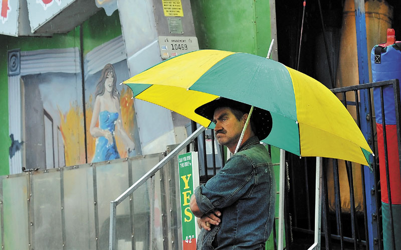 Gerry Ingersoll, a ticket-taker for Fiesta Shows at the Skowhegan State Fair, tries to stay dry as he passes the time waiting for the next customer at the Earth Quake walk-through on Tuesday.