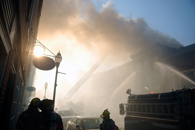 An apartment tenant was taken to the hospital for smoke inhalation and three firefighters were injured as businesses around 235 Water St. were ordered to evacuate after the fire spread to other buildings Thursday afternoon.