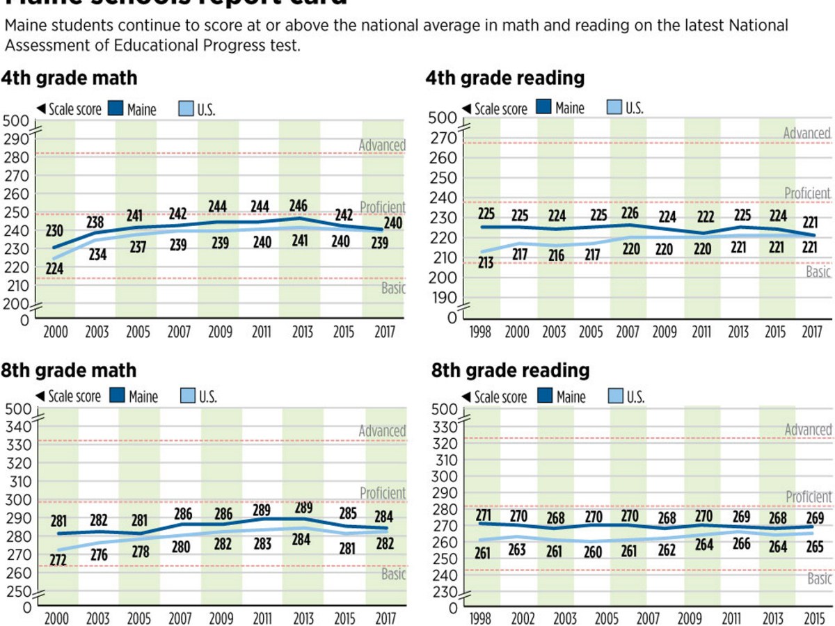 Maine meets or exceeds national averages, but falls short of Northeast states’ results in math and reading.