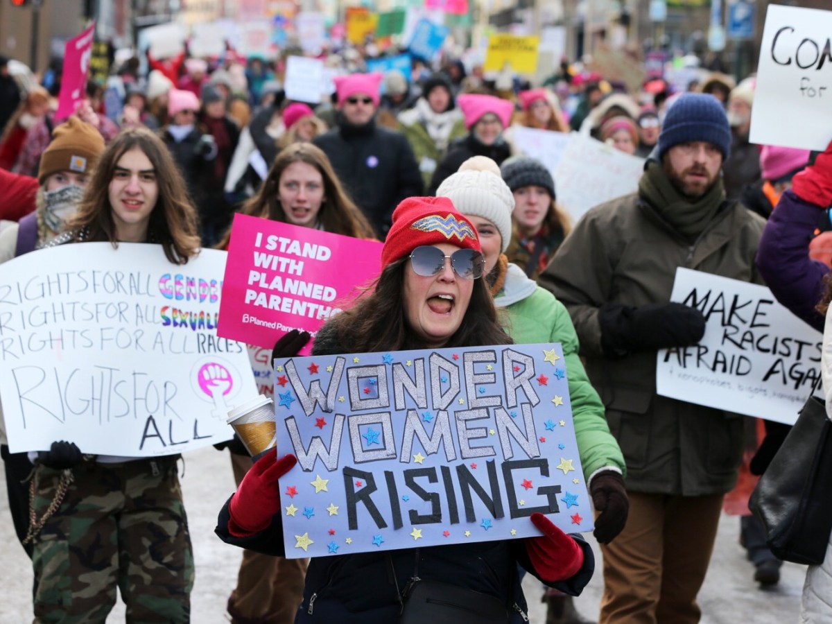 Protesters at one of dozens of rallies held around the country Saturday carry signs supporting the impeachment of President Trump and singling out Sen. Susan Collins.