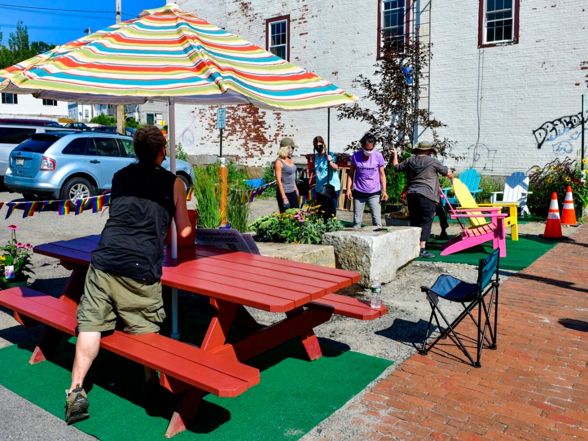 Volunteers set up the pocket park Saturday morning at the corner of Central and Water streets. It is scheduled to remain for two weeks as a test run.