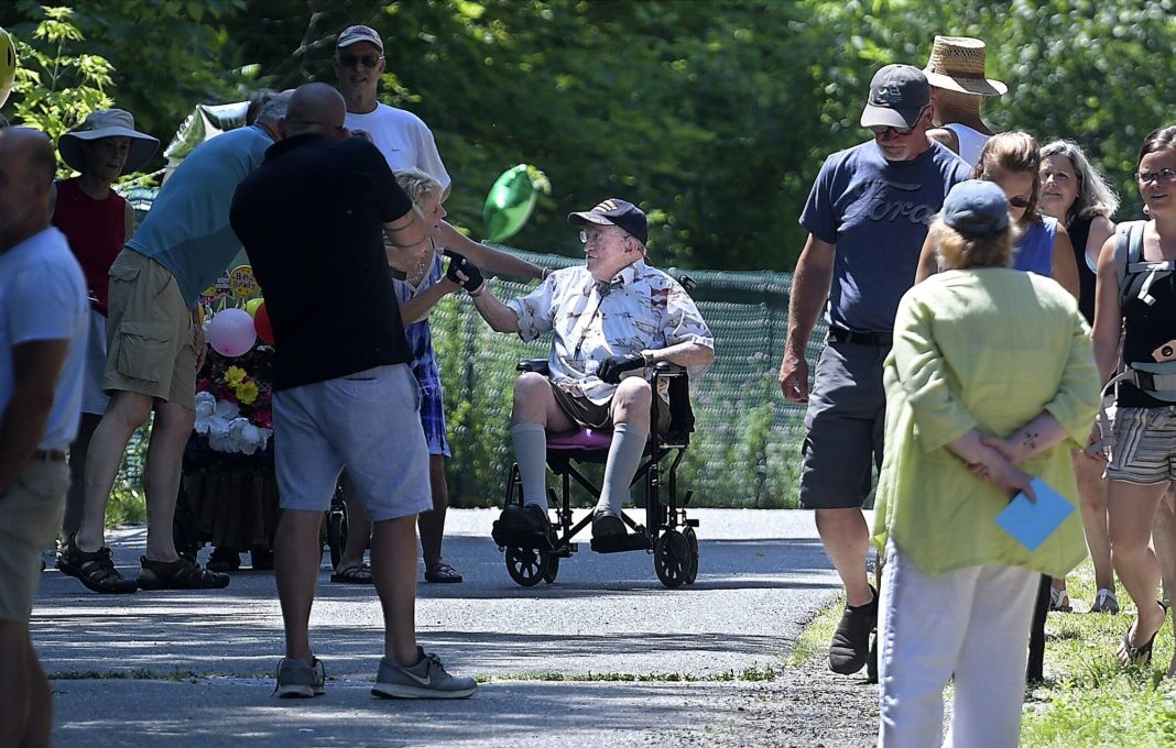 Two dozen people lined the sides of the Kennebec River Rail Trail on Sunday to help celebrate the birthday of Al Kavanagh, a World War II veteran who has regularly walked the trail for the last five years.