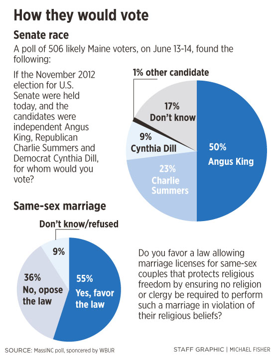 A new poll shows that independent Angus King is the heavy favorite to succeed U.S. Sen. Olympia Snowe, and that a ballot question that would allow same-sex couples to marry in Maine has strong support.