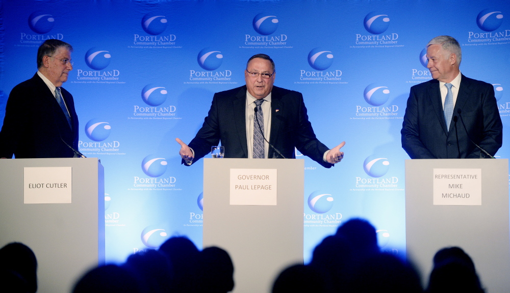 The trio’s first public face-off covers the governor’s record, preventing job losses, Maine’s colleges, tax issues and more.