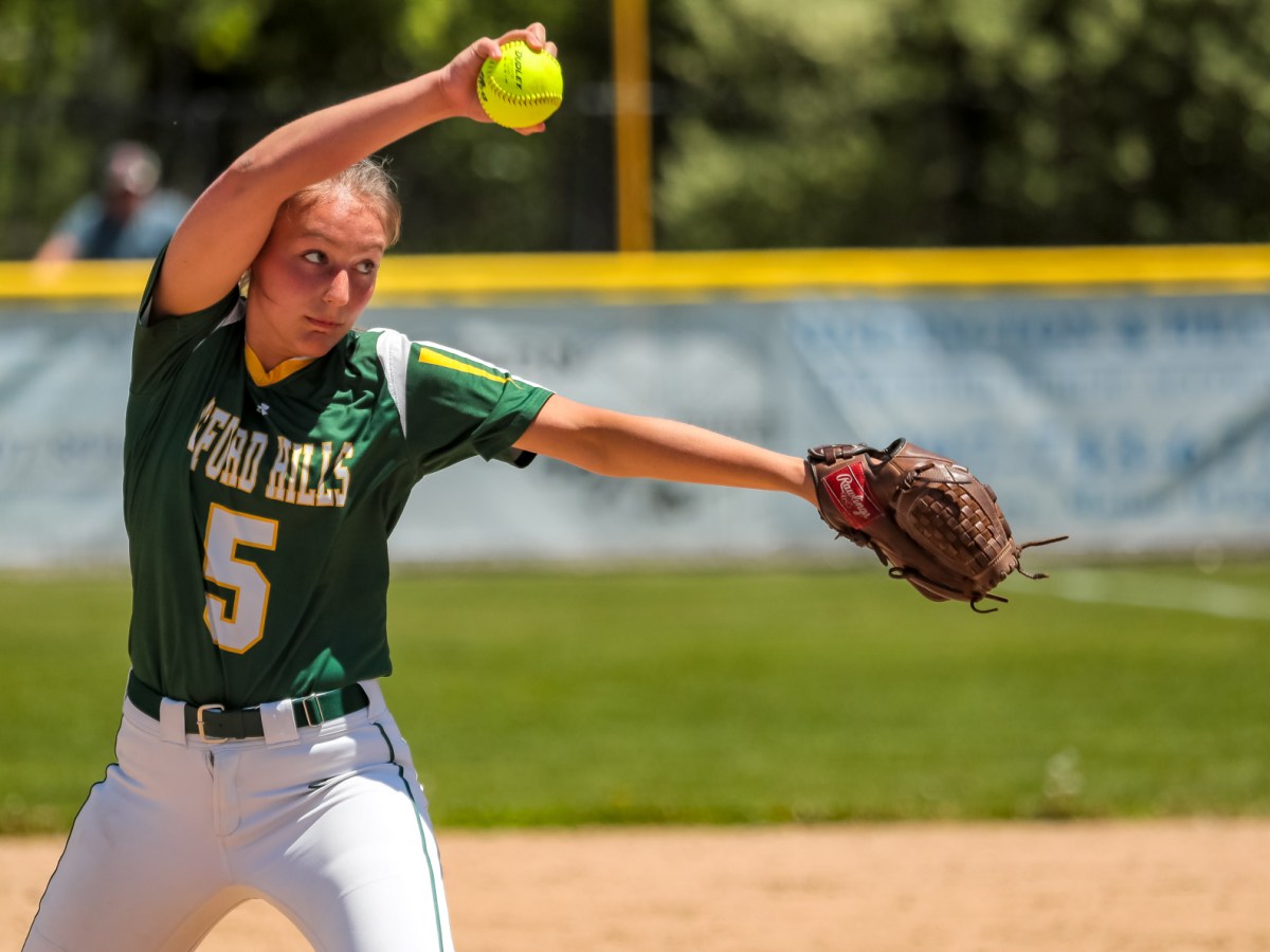 Lauren Merrill, who struck out six batters and didn’t walk anyone, throws a two-hit, 10-0 victory against the Rams.