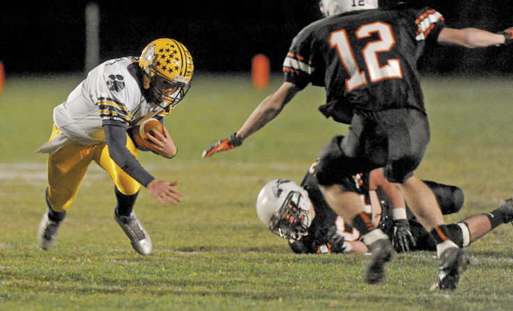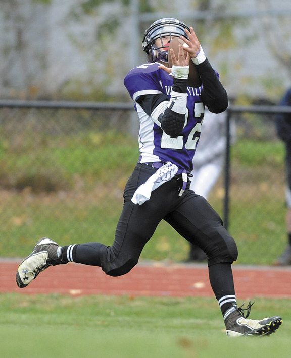 This game featured four lead changes in the second half, including two in the final 44 seconds. It wasn’t decided until Waterville’s Dalton Denis caught a 37-yard touchdown pass from Brian Bellows with 20.3 seconds left, giving the Purple Panthers a 25-21 win at Drummond Field.