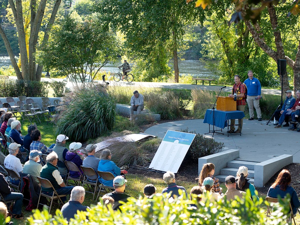 About 200 people gather along the Androscoggin River to commemorate five decades of the Clean Water Act.