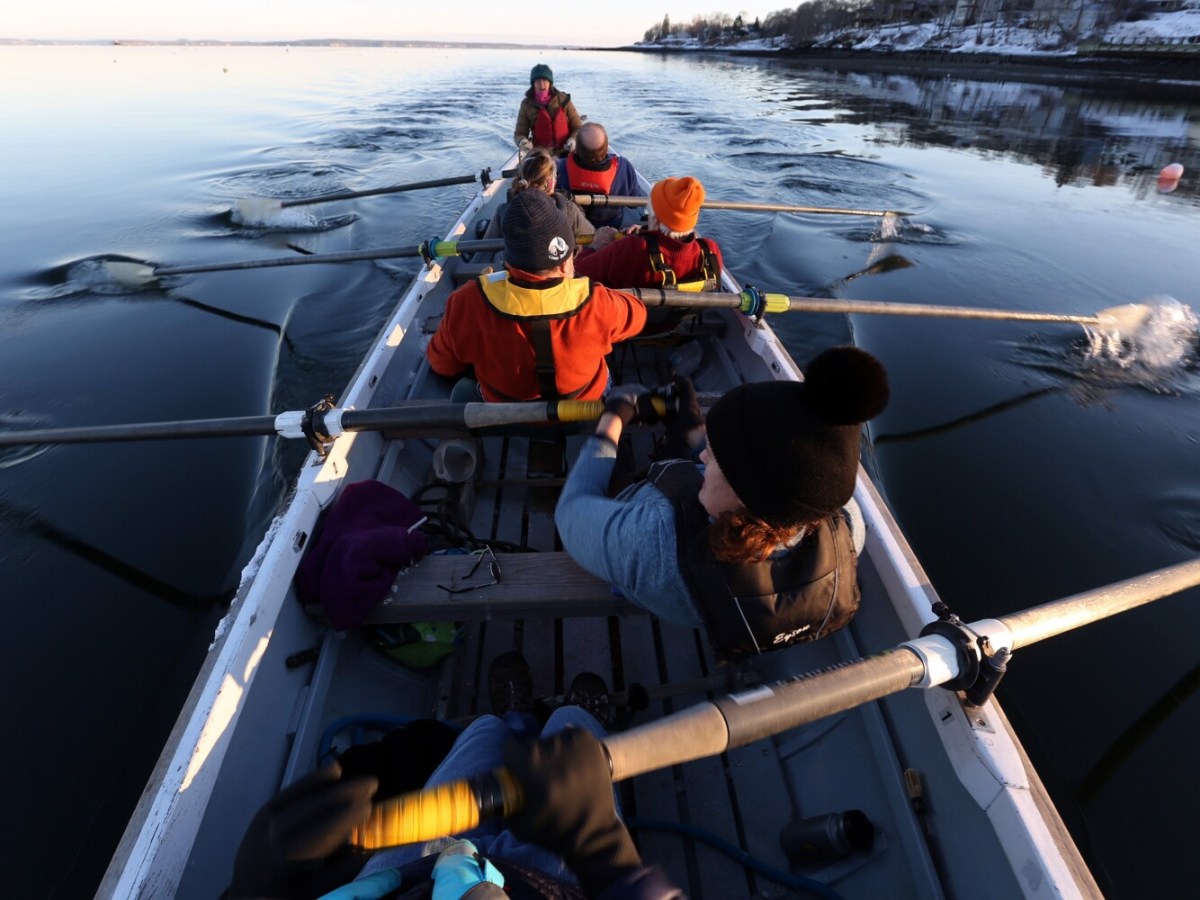The community rowing program, Come Boating, launches six-oar Cornish pilot gigs year-round.