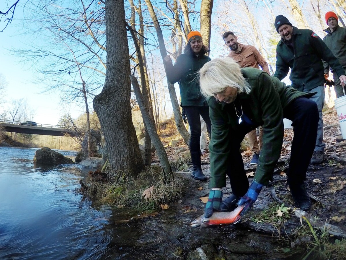 In Photos: Gov. Mills joins fisheries officials to help stock the Presumpscot