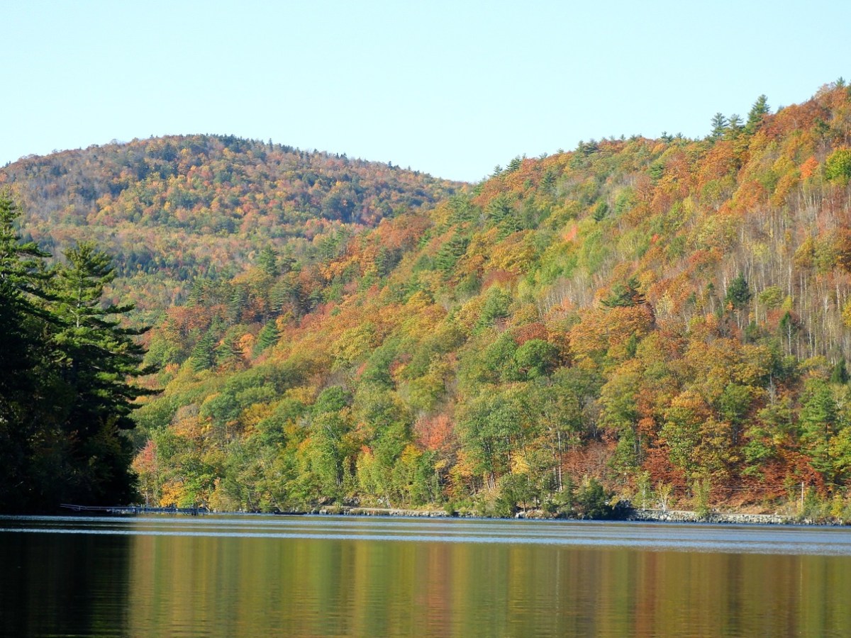 The views include the steep hillsides of Mt. Abram plunging straight down to water’s edge on the western side of the pond, and the massive wall of vertical cliffs on Buck’s Ledge to the north.