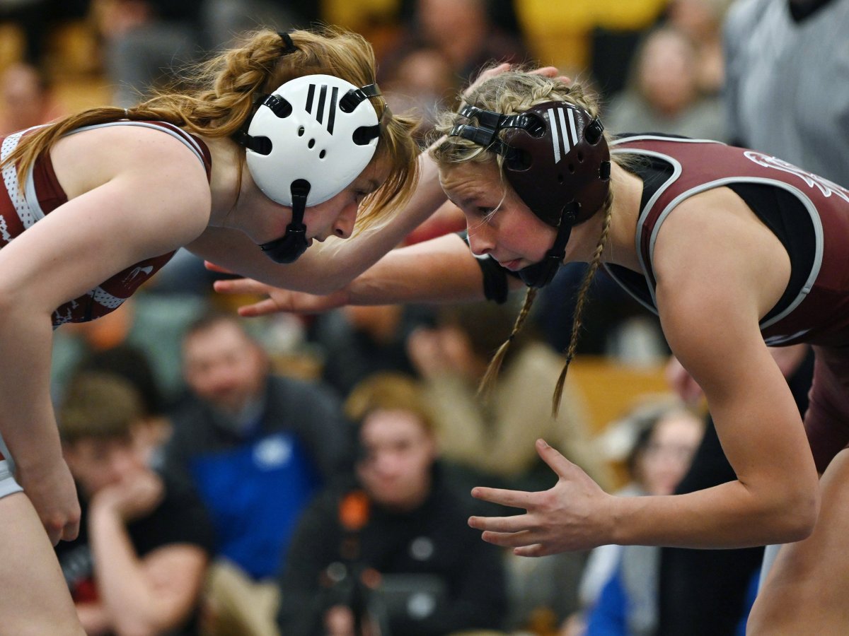 With individual titles from sisters Nevaeh and Sophie Grunhuvd, the Mustangs beat host Mt. Blue in year two of the girls team competition.