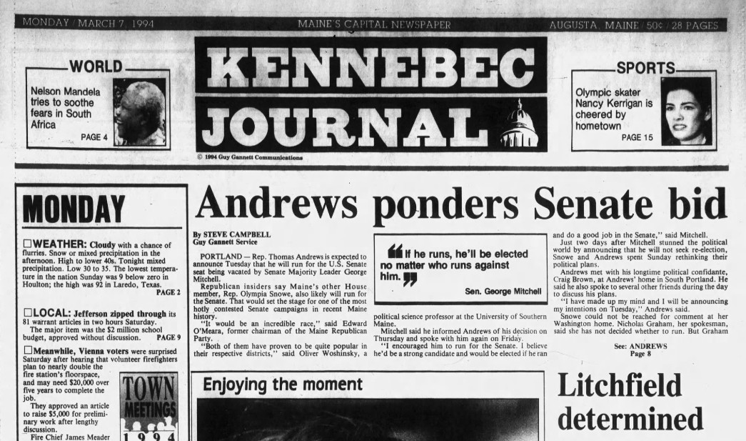 March 7, 1994: Town of Litchfield to start anew after fire devastates elementary school, representative pondering Senate bid, and new rules will mean more frozen fish in Maine stores