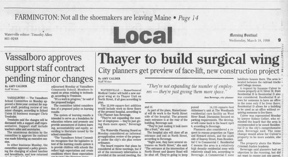 March 18, 1998: MaineGeneral Thayer in Waterville to build new surgical wing, Wilton waiting on word on shoe shop space, and Vassalboro approves support staff contract