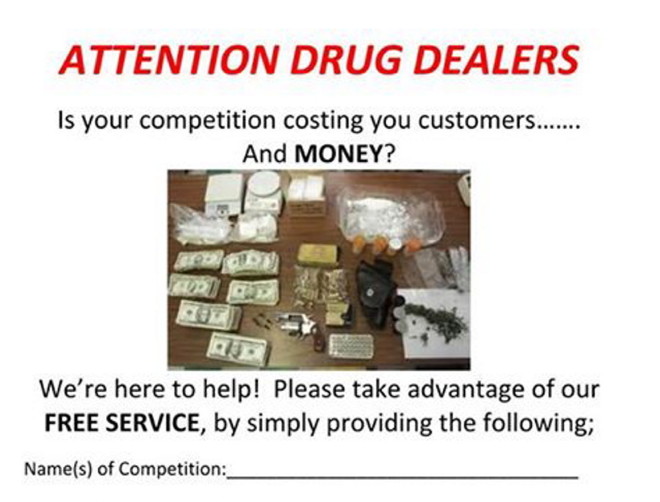 Flier posted on the department Facebook page advertises a “free service” for dealers to get rid of rivals costing them money and customers.