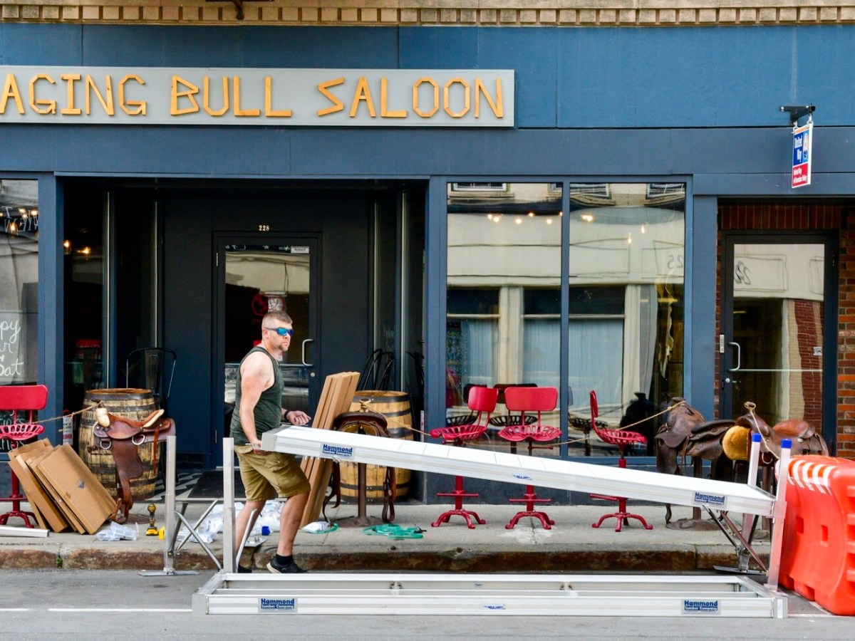 To provide outdoor seating for two downtown restaurants, Augusta city officials secured aluminum docking to build parklets that were installed Saturday in front of the Oak Table and the Raging Bull Saloon.