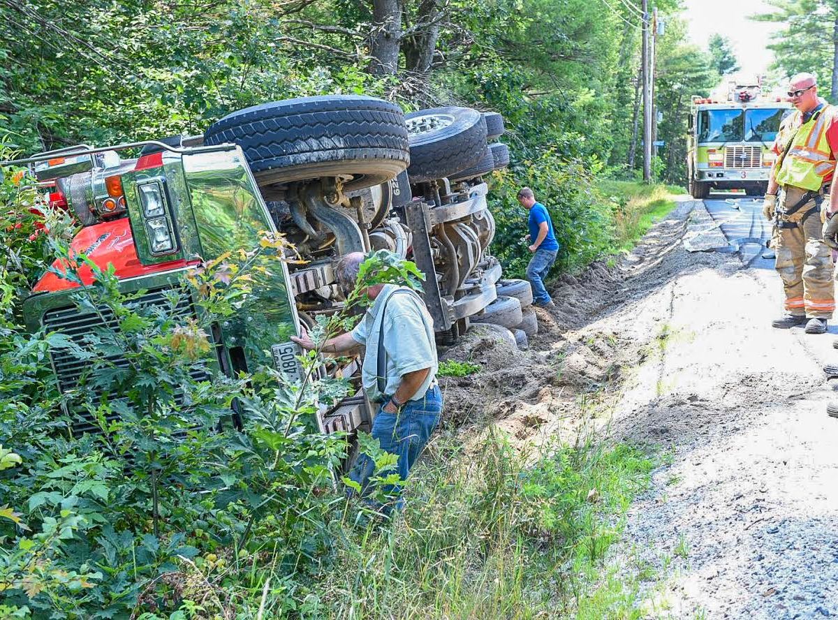 A dump truck rolled over on Ferry Road in Lewiston on Friday morning.
