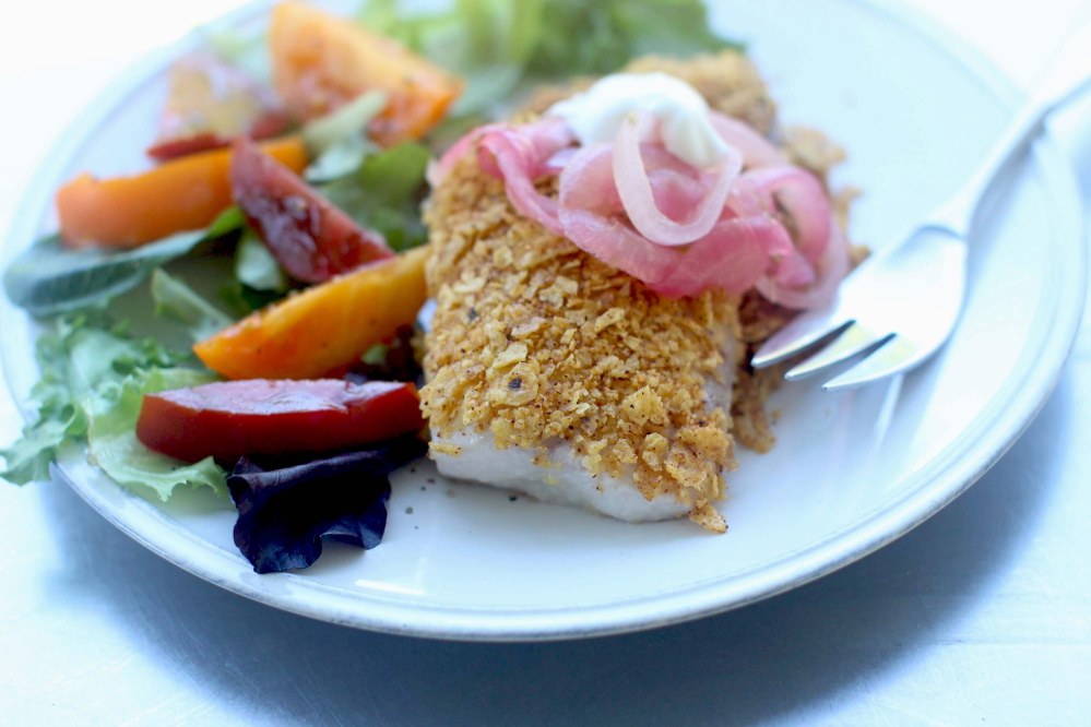 The white fish with a tortilla-chip crust, pickled red onions and crema makes a good weeknight meal.