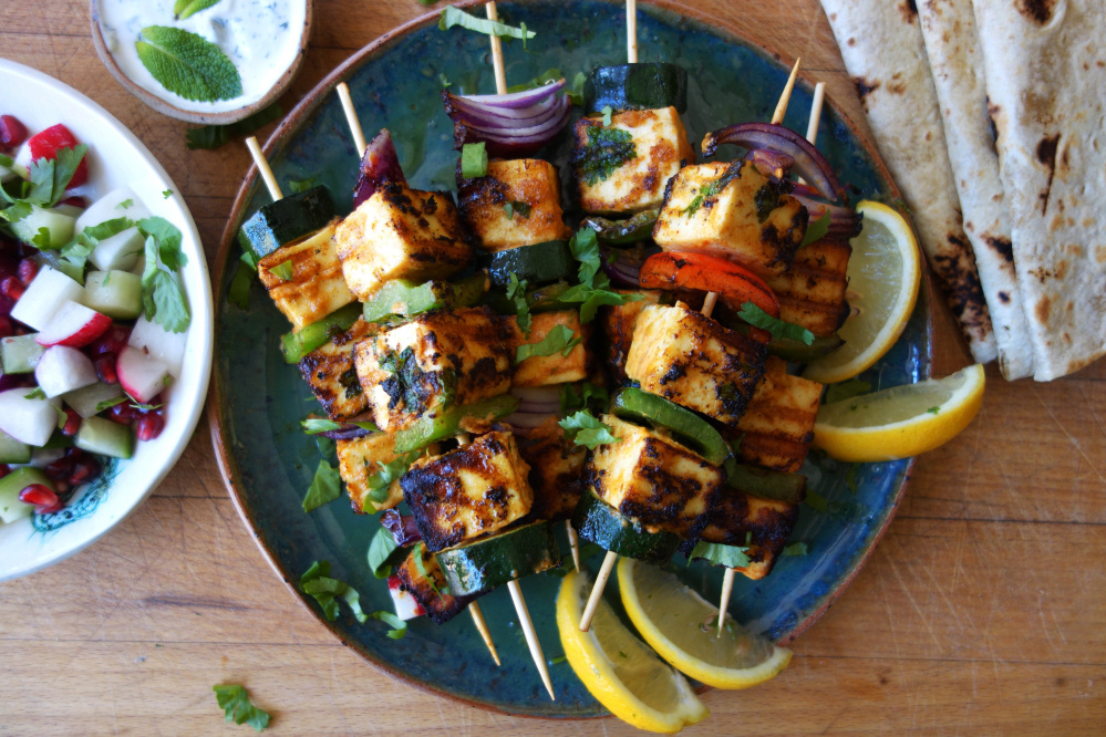 An Indian marinade gives the cheese an enticing flavor.