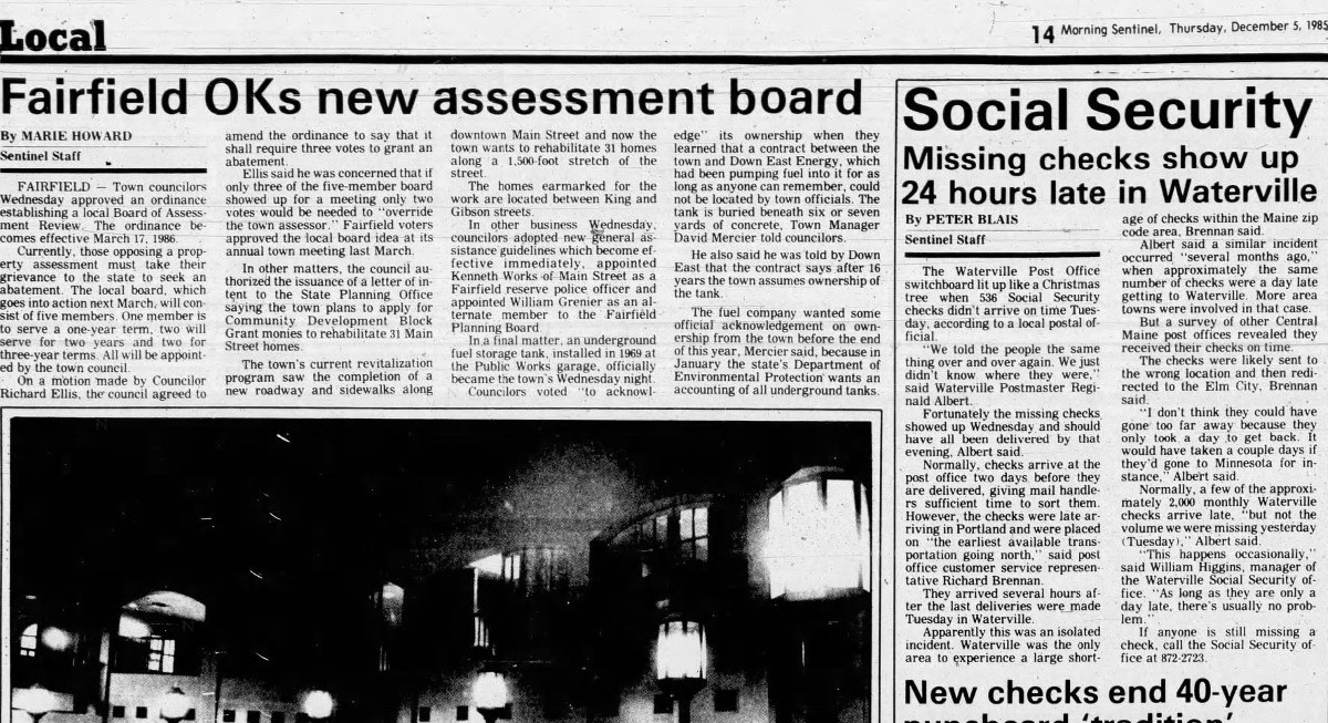 Dec. 5, 1985: 536 missing social security checks show up 24 hours late in Waterville, Fairfield OK’s new assessment board, and here’s a look at Colby College’s new Student Center