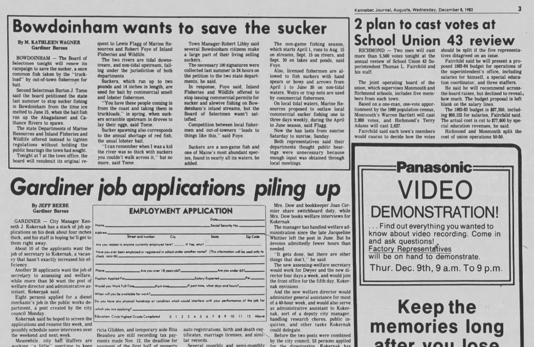 Dec. 8, 1982: Town of Bowdoinham wants to ‘save the sucker’, Gardiner job applications piling up, and the slow speed of an audit in Winthrop draws complaints from council members