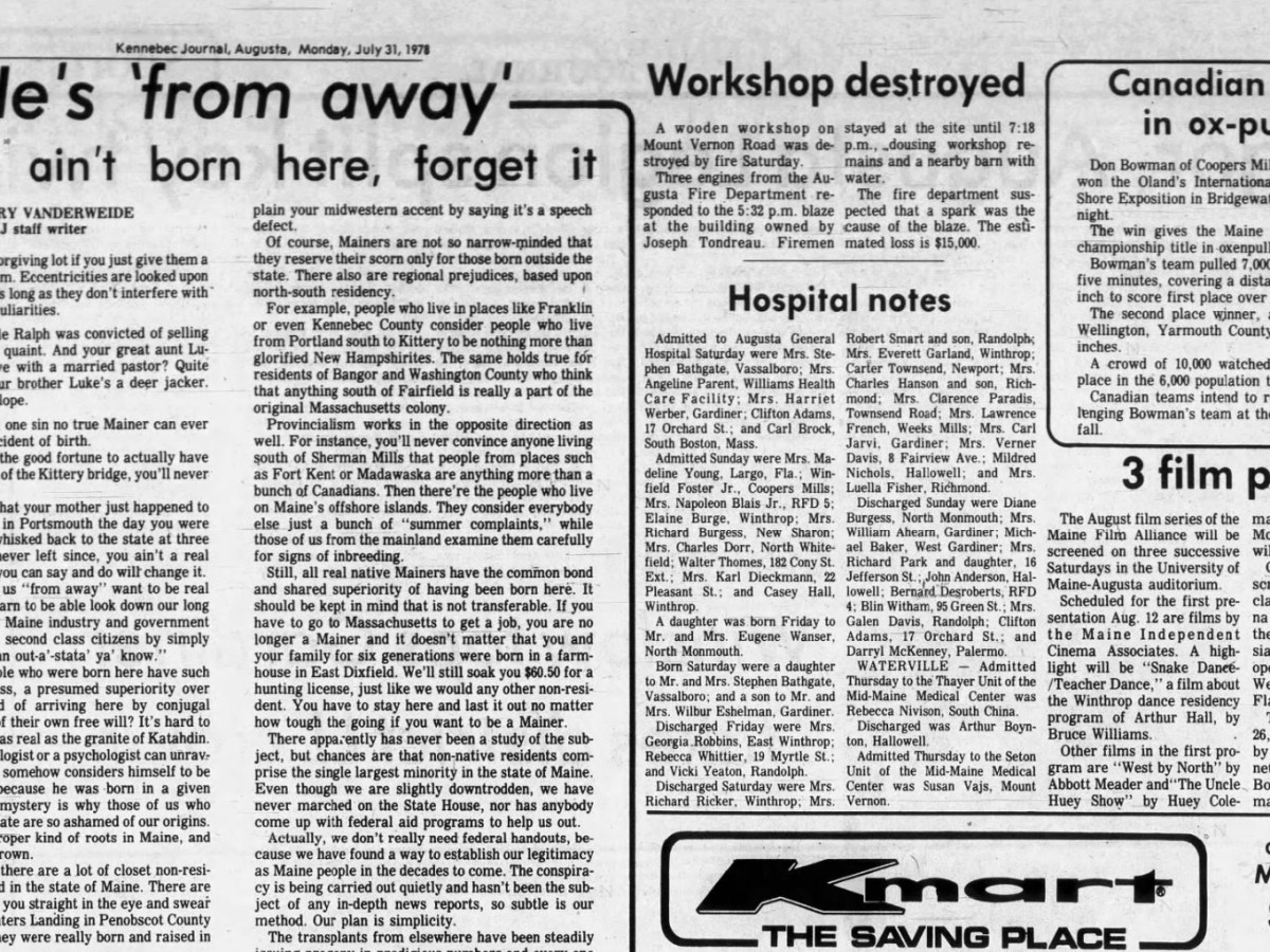 July 31, 1978: Coopers Mills man and his oxen win ox-pulling contest in Nova Scotia, wooden workshop destroyed by fire in Augusta, and ‘if you ain’t born here, forget it’