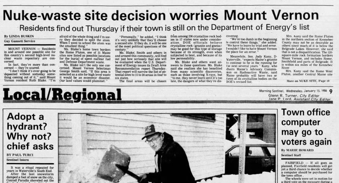 Jan. 15, 1986: ‘High level’ nuke-waste site decision worries town of Mount Vernon, Voters to get a third chance to decide whether a computer should be purchased for Fairfield town office, and adopting a fire hydrant?